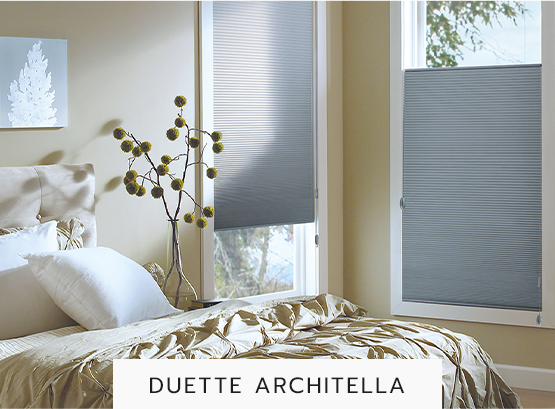 Exclusive fabrics, energy-saving innovations. Our stateof-the-art, patented design for these attractive shades incorporates three insulating air pockets reducing heat loss at the window by 40%. Duette® Architella® honeycomb shades offer luminous colours and crisp, consistent pleats. Lower them for privacy, or raise completely for maximum light and view—they’re beautiful either way.